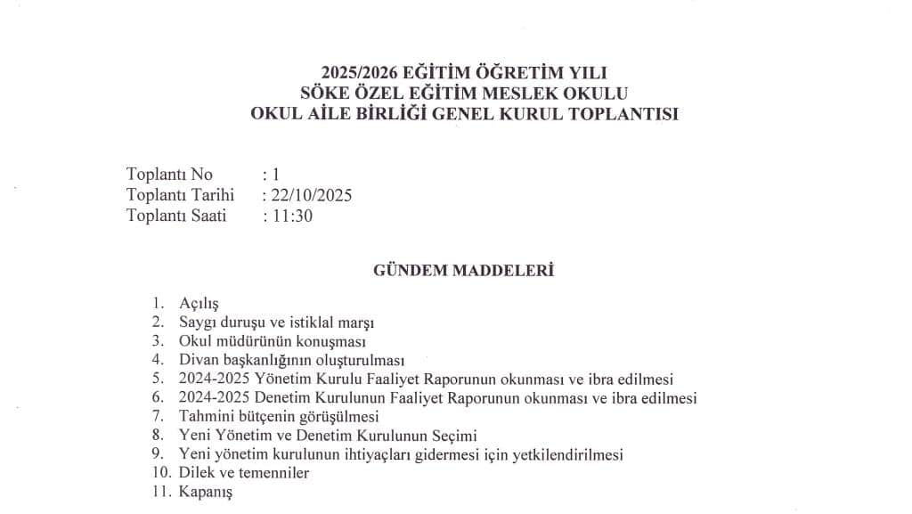 2025-2026 EĞİTİM ÖĞRETİM YILI OKUL AİLE BİRLİĞİ TOPLANTISI 22/10/2025 TARİHİNDE SAAT 11,30'DA OKULUMZDA YAPILACAKTIR. TÜM VELİLERİMİZ DAVETLİDİR.